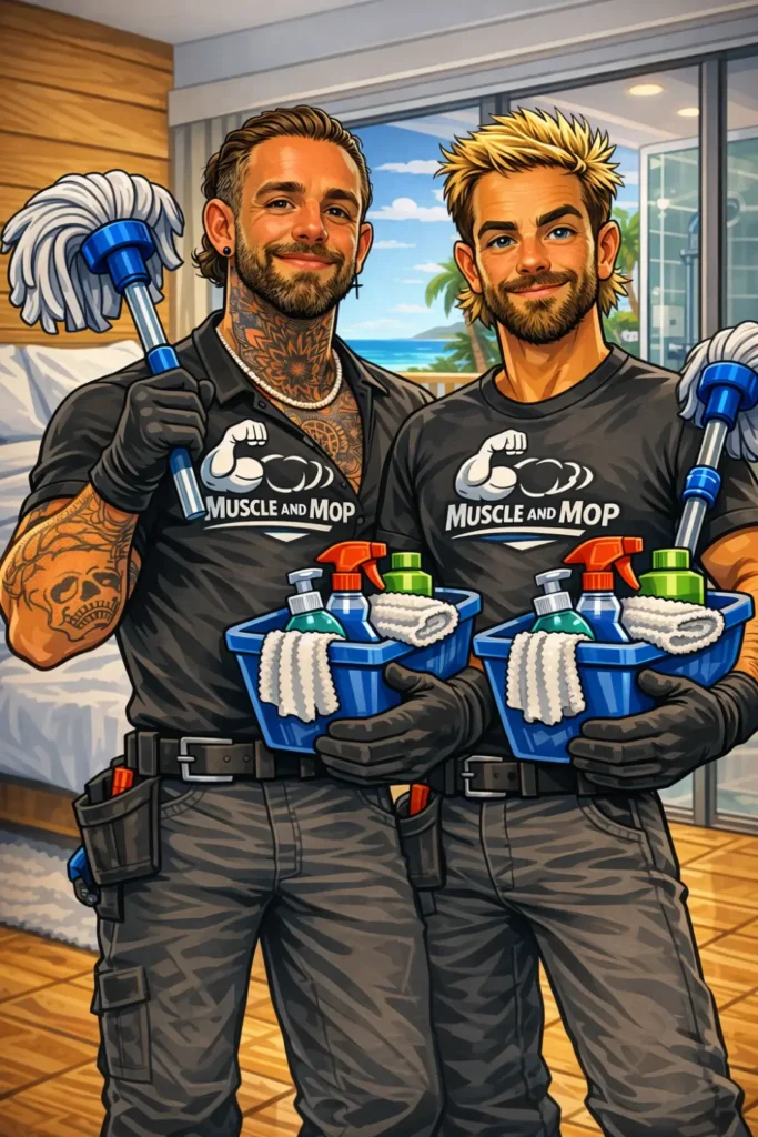 The name Muscle & Mop isn’t just a clever brand; it’s our lifestyle. We love fitness, we love the hustle, and we wanted our business to reflect that energy. We’re two fit young guys who aren’t afraid of the heavy lifting—and let’s be honest, we’re not exactly a sore sight on the eyes, either. We bring a cheeky twist to a dusty industry because we believe looking good and working hard go hand-in-hand.